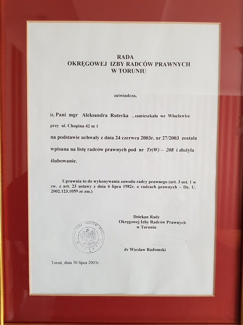 Wpis na liste Radców Prawnych w roku 2003.